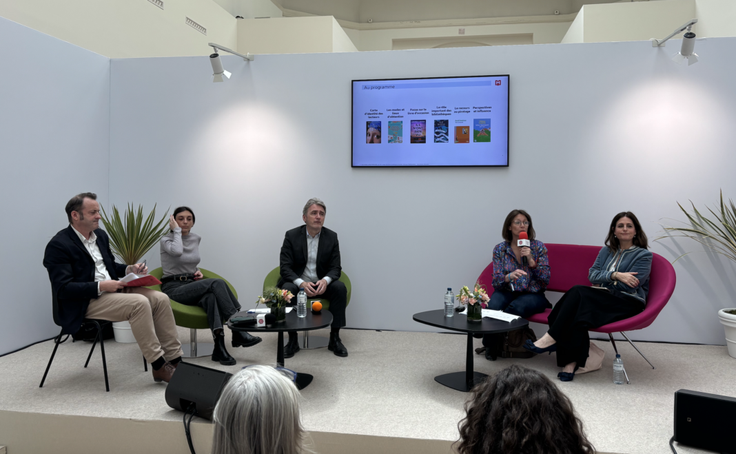 À l’occasion du premier jour du Festival du Livre de Paris, les acteurs de la filière se sont réunis lors d’une table ronde consacrée à la présentation des résultats de la 14e édition du baromètre des usages du livre. Étaient présents Marine Boulanger, directrice Cinéma et Entertainment chez Médiamétrie, Mathilde Jablonski, directrice de Cascades et présidente de la commission Livre Audio du SNE, Natasha Pauthier, chargée d’études et marketing produits chez Médiamétrie, ainsi qu’Arnaud Robert, secrétaire général du groupe Hachette Livre.