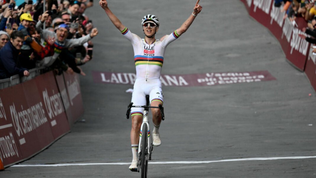 Tadej Pogacar, qui égale le record de victoires dans la classique italienne du Suisse Fabian Cancellara, a devancé au terme d’une course de 213 kilomètres – dont 82 kilomètres de chemins empierrés – de plus d’une minute le Britannique Tom Pidcock (Q36.5), auteur de l’accélération décisive à 78 kilomètres de l’arrivée.