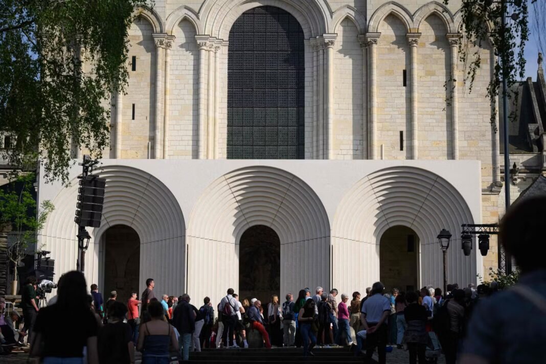 En cette belle fin d’après-midi du jeudi 9 avril, le parvis de la cathédrale Saint-Maurice d’Angers était noir de monde, l’atmosphère festive. On venait pour l’inauguration de la nouvelle galerie contemporaine, une greffe de béton accolée à la façade médiévale et destinée à protéger les polychromies du portail gothique. Après des années de micropolémiques – sur le parti pris contemporain, le choix du matériau, la nationalité japonaise de l’architecte, Kengo Kuma… –, tout semblait au diapason : chants liturgiques, bénédiction de l’ouvrage par l’évêque, discours de Catherine Pégard, la ministre de la culture, et, à la tombée de la nuit, spectacles de danseurs et d’acrobates.
